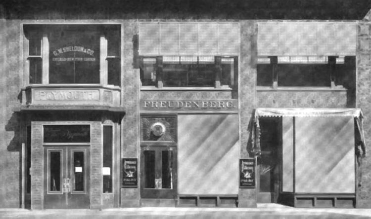 One of his most outstanding developments was the Plymouth building at 417 South Dearborn Street, Chicago, completed in 1899. It displays the influence of his former employers, Adler and Sullivan: The two-story building is a mix of early steel-frame construction and an early example of cast-metal Sullivanesque with two primary facades on both South Dearborn Street, and Plymouth Court.